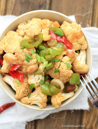 Add ginger, garlic and scallion to stir-fry until aroma. Place pepper pieces in to cook until soft. Return cauliflower florets in. Mix well.