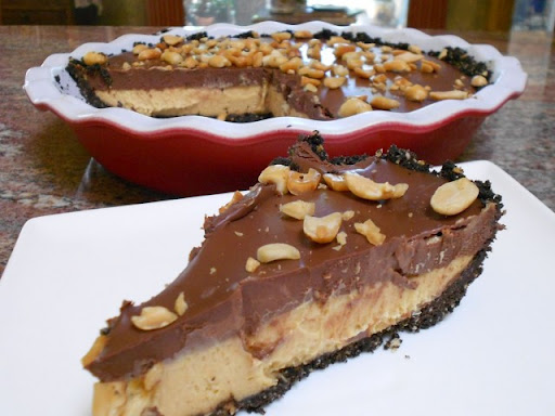 Put the chocolate wafers and peanuts in a food processor and pulse until they resemble course crumbs. Pour into a bowl and add the melted butter. Mix and mold into a buttered 9 inch pie pan. Place in a preheated 325 degree oven for ten minutes. Remove and let cool.