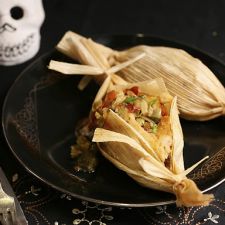 Smooth the masa onto your largest corn husks until about 1/4- to 1/2-inch thick. You want it to cover about a 3-inch square of the husk, if possible. Place 1 to 2 tablespoons of the lentil filling into the center of the masa dough. Fold the sides of the corn, then fold the top and bottom of each husk down. Set the tamale bottom-side-down in a large roaster pan, fitted with the rack on the bottom of the pan. (If you need to wrap the tamales rolled in smaller corn husks with a second or third husk, or even tie some of them together with a small piece of husk, go for it! This is an imperfect science!)