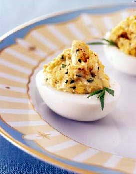 Mound crab mixture in cavity of each egg-white half (about 1 heaping tablespoon for each). (Can be prepared 4 hours ahead. Cover and refrigerate.) Place crab-stuffed deviled eggs on platter. Garnish each with small tarragon sprig, if desired, and serve.