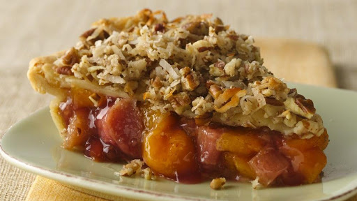 An old-fashioned combination, peach and rhubarb, is sweetened with a crunchy pecan and coconut topping. Perfect summer pie when both peaches and rhubarb are fresh.