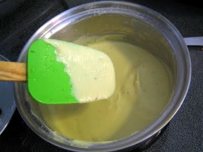 3. Transfer to saucepan and bring to a simmer over medium heat. Reduce heat to low and cook for about 10 minutes, stirring frequently, until cooked through and thickened.