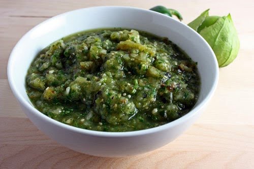 2. Broil in the oven until the tomatillos are blackened all over and the jalapenos skin is blackened. Note: You may have to remove the peppers from the oven before the tomatillos. (Feel free to remove the charred outer skins first.)
