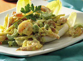 Just before serving, gently stir shoestring potatoes and cashews into shrimp mixture. Arrange endive leaves, pointed ends out, around edge of medium serving platter or 4 plates. Spoon shrimp mixture into center of platter or divide among 4 plates. Sprinkle with additional cashews and shoestring potatoes if desired.