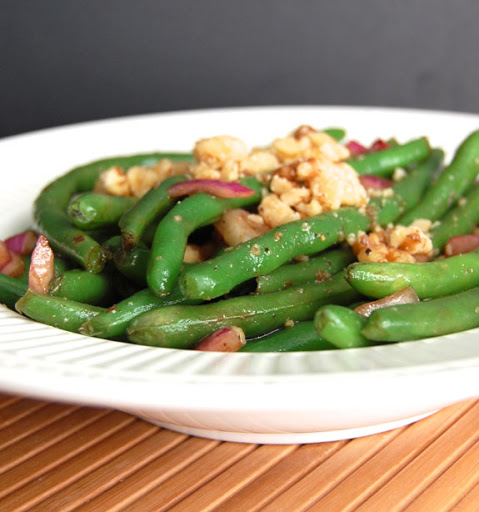 Place the green beans and red onion in a large bowl. Toss in the olive oil to coat. Sprinkle in the balsamic and season with salt and freshly ground black pepper. Top with chopped walnuts to serve.