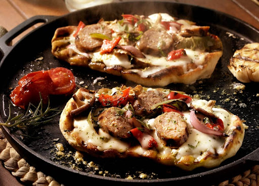 top with mozzarella. Arrange the grilled vegetables and sliced sausage on top.