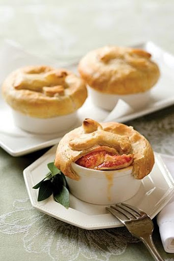 Preheat the oven to 375 degrees F. Grease a rectangular glass baking dish. In a large saute pan, melt the butter. Add the onions and celery and saute for 2 minutes. Season with salt and pepper. Stir in the flour and cook for about 3 to 4 minutes for a blond roux. Stir in the stock and bring the liquid up to a boil. Reduce to a simmer and continue to cook for 8 to 10 minutes, or until the sauce starts to thicken. Stir in the milk and continue to cook for 4 minutes. Season with salt and pepper. Remove from the heat. Stir in the potatoes, carrots, peas, ham and lobster. Season with salt and pepper. Mix the filling thoroughly. If the filling is too thick, add a little water to thin out the filling. Pour the filling into the prepared pan. Place the crust on top of the filling. Carefully tuck the overlapping crust into the pan, forming a thick edge. Crimp the edges of the pan and place on a baking sheet. Using a sharp knife and make several slits in the top of the crust. Place the dish in the oven and bake for about 25 to 30 minutes or until the crust is golden brown and crispy. Remove from the oven and cool for 5 minutes before serving.