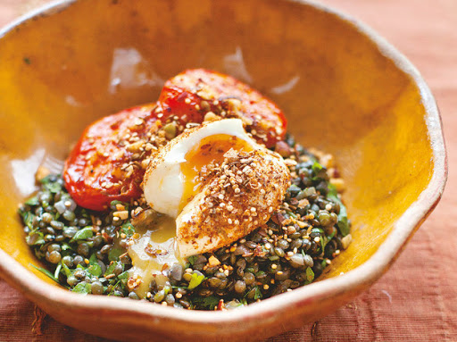 Roasted Tomatoes and Lentils With Dukka-Crumbed Eggs
