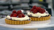 Step 7: Top tarts with lavender cream and decorate with raspberries. Decorate tarts with extra lavender flowers.