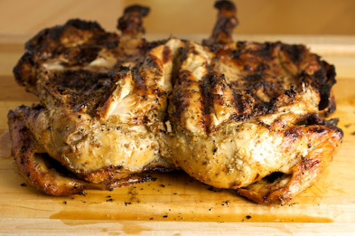 2. Preheat a grill (medium-low heat). Remove the chicken from the marinade and place on the grate, skin side up. Cover the grill and cook for 10 minutes, until the chicken is lightly charred. Flip the chicken over, then place a brick on top of each half so that it presses the chicken firmly and evenly against the grate. Cook for another 15-20 minutes, until the skin is thoroughly browned and crisp and the meat pulls away easily from the bone. (If the grill flares up, move the chicken to a collar part of the grill.) While the chicken cooks, toss on the lemon halves, cut side down, and grill until charred and juicy.