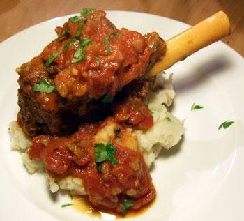 Add wine, scraping up any brown bits, then add warm demiglace, tomatoes, and bay leaf. Return shanks (with any juices accumulated on plate) to pot and bring liquid to a boil, then cover pot and braise shanks in oven until meat is very tender, about 2 1/2 hours.
