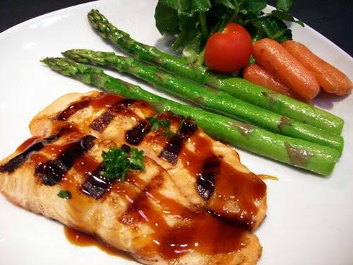 In a baking dish large enough to just hold salmon steaks in one layer marinate salmon in sauce, turning to coat, 15 minutes.