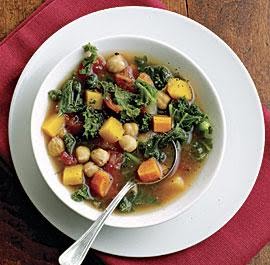 Heat the oil in a large soup pot over medium-high heat. Add the carrots and onion and cook, stirring occasionally, until they begin to soften, about 6 minutes. Add the garlic and cook for 1 minute more. Add the squash, allspice, cayenne, and 1 tsp. salt and stir to combine. Add the broth, tomatoes with their juice, and thyme. Bring to a boil, reduce the heat to medium, cover, and simmer for 10 minutes. Add the kale and the chickpeas and cook uncovered until the squash is tender and the kale has wilted, about 10 minutes more. Discard the thyme springs before serving. Season to taste with more salt and cayenne.