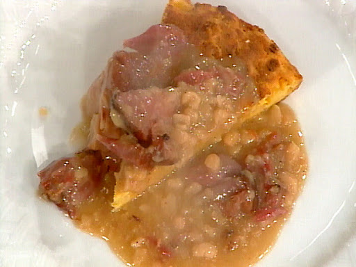 In a medium Dutch oven with a lid, over medium heat, add the oil. When the oil is hot, sear the ham hocks in batches, until brown, about 4 to 6 minutes. Remove the ham hock and set aside. Add the onions. Season with pepper. Saute for 2 minutes. Stir in the beans and bay leaves. Season with pepper. Saute for 1 minute. Add the reserved ham hocks and water. Bring to a boil and reduce the heat to medium low and simmer for 2 hours, or until the meat falls of the bone and the beans are creamy. Remove the bay leaves and season with salt and pepper.