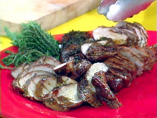 Place tender loins on a nonstick cookie sheet with a rim. Coat tenderloins in a few tablespoons of balsamic vinegar, rubbing vinegar into meat. Drizzle tenderloins with extra-virgin olive oil, just enough to coat. Cut small slits into meat and disperse chunks of cracked garlic cloves into meat. Combine steak seasoning blend or coarse salt and pepper with rosemary and thyme and rub meat with blend. Roast in hot oven 20 minutes.