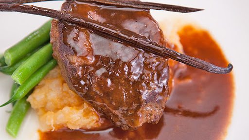 Transfer cheeks into a cast-iron casserole dish. Saute the celery, carrot, shallots and garlic in the remaining 2 tablespoons olive oil, in the same saucepan that the beef cheeks were fried in. Deglaze with the port and pour the mixture into the casserole with the beef cheeks. Add in the remaining ingredients (including vanilla bean and seeds). Add extra water to cover, if required. Place a cartouche (a piece of baking paper, cut to the size of the casserole dish) on the surface of the beef cheeks.