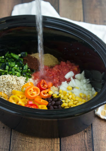 3. Chop the sweet peppers and poblano chili pepper (remove seeds if desired). Add the chopped peppers, minced garlic, and chopped onion to the slow cooker. Stir everything together. Add in the chili powder, ground cumin, and water. Stir again and cook for 3-4 hours or 5-6 hours on high or until the water is completely absorbed and the quinoa is cooked through. All slow cookers cook a little differently so make sure to occasionally check the dish to make sure the quinoa isn't burning or sticking all to the sides.