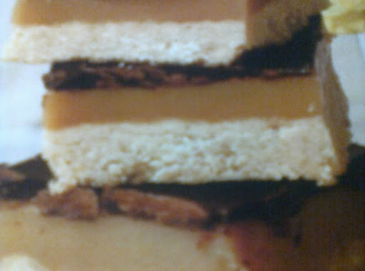 4) Melt the chocolate, the pour it evenly over the caramel layer. Cool completely in the pan, then use the parchment paper to lift the shortbread out of the pan. Cut into squares. Makes 36-40 bars.