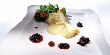 2. On a floured surface, roll the dough into a 25 x 38-cm (10 x 15-inch) rectangle. Arrange the cheese pieces along the edge of the shorter side. Cut the dough between the pieces, leaving a 1-cm (1/2-inch) border around each. Brush the border with egg white. Cut the remaining dough into 4 squares and use to cover the cheese pieces. Trim any excess dough, leaving a 2-cm (1-inch) edge. Fold 1 cm (1/2 inch) of the edge back toward the cheese. Using the tines of a fork, press the edge around each piece to seal. Make a pea-sized hole in the dough above each piece of cheese. Transfer to the parchment lined baking sheet. Beat the egg yolk with the remaining white and brush the dough with the mixture. Freeze for 20 minutes or refrigerate for 45 minutes.