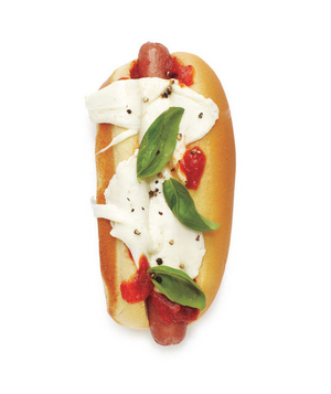 Place a hot dog in each bun and, dividing evenly, top with the marinara and mozzarella. Grill, covered, or broil until the mozzarella has melted, 1 to 2 minutes. Dividing evenly, top with the basil.