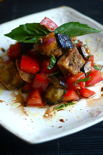 4. Meanwhile, chop up the tomatoes and red onion, and mince the garlic clove and basil. when the baked ingredients are slightly cooled you can mix everything together with the remaining olive oil and balsamic vinegar.