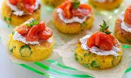 4. Spread each cake with about 1 tsp. pimiento cheese. Top aeugula, tomato, basil and kosher salt & pepper.
