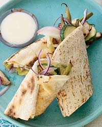Arrange the pitas cut side up on a work surface and brush each round with about 1 1/2 teaspoons of the yogurt sauce. Divide the chicken, roasted vegetables and red onion among the pitas and roll the bread around the filling into tight cylinders.
