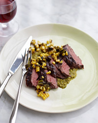 Grilled Skirt Steak with Poblano-Corn Sauce and Salsa