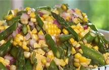 In another medium size bowl, mix together sugar, vinegar, salt, and pepper. Drizzle over corn and asparagus. Mix together well and chill or serve at room temperature.
