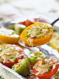 1. Preheat oven to 350 degree F. Cut each tomato into 4 slices, about 1/2 inch thick. If using smaller tomatoes, halve each one. For each of 4 servings, arrange 3 tomato slices, overlapping slightly, in a foil-lined, 15x10x1-inch baking pan. (Or, if using smaller tomatoes, arrange in a single layer in a foil-lined,15x10x1-inch baking pan.) Sprinkle with shredded cheese, finely chopped pepper, and toasted almonds. Bake about 15 minutes or until cheese is bubbly. Carefully lift with large metal spatula to individual plates, allowing excess juices to drain off.
