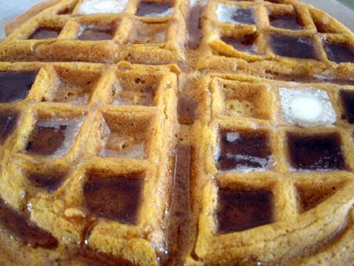 Preheat oven to 250°F and preheat waffle iron. Sift together flour, brown sugar, baking powder and soda, salt, and spices. Whisk egg yolks in a large bowl with buttermilk, pumpkin, and butter until smooth. Whisk in dry ingredients just until combined.