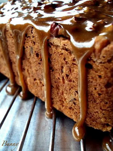 I was trying to remember how many times I've made this bread in the last couple of months. I think the first time was in the begining of October. My husband loved this so much he asked me to make it for his birthday, which is the end of October. I've made it two more times since then. I've never blogged about it because it never stuck around long enough for me to get pictures. I made a point of doing that today. Everyone that's tasted it has absolutely loved it, hands down this is one fantastic quick bread. You'll notice that the recipe for the bread doesn't include any fat in the form of butter or shortening. The bread derives it's moistness from sour cream. The top of the bread is bathed in praline and ....well it's praline, nuff said.