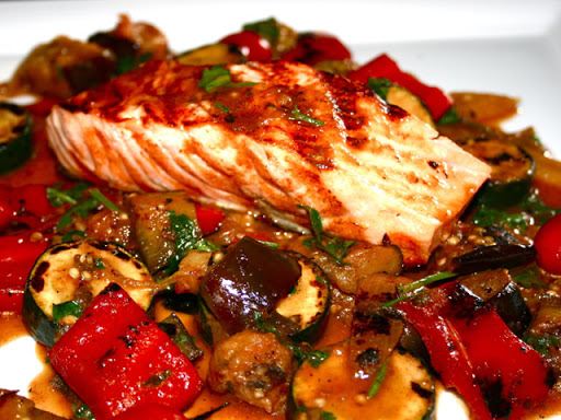 Preheat a grill or grillpan to medium high. Brush grill with olive oil. Season the chicken on all sides with salt and pepper. Grill chicken for 5 to 6 minutes per side, until juices run clear when pricked by a fork. In a large bowl, whisk together the olive oil, balsamic vinegar and garlic. Toss vegetables bowl and season with salt and pepper. Reserve vinaigrette after removing vegetables for grilling. While chicken is resting, arrange the vegetables on the grill, being mindful not to crowd. Cook for 2 to 3 minutes per side, until softened. Add basil and capers to remaining vinaigrette and whisk. Transfer vegetables to the bowl with the vinaigrette. Toss to coat and season with salt and freshly ground pepper. Garnish with extra basil. Serve chicken over grilled vegetable ratatouille.