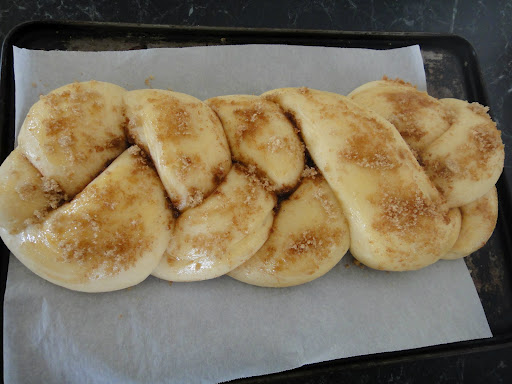 Divide dough into thirds. On a lightly floured workbench, roll each portions into an 18 inch long rope. Put two ropes across at the top end and then lay the third one in between, tuck the top bits under. Braid the ropes into a neat shape.
