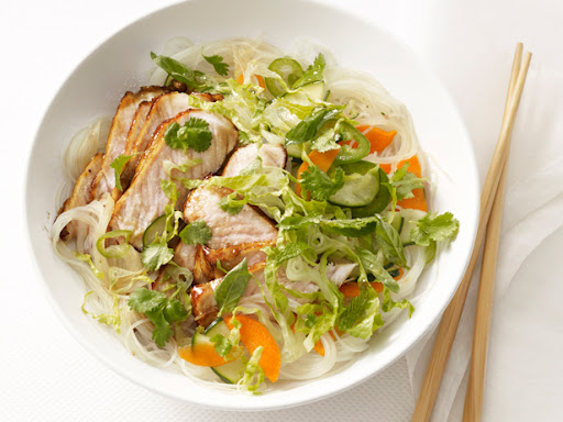 Make the pickled vegetables: Put the carrots, cucumbers and jalapeno in a bowl. Heat the rice vinegar and fish sauce in a saucepan, then pour over the vegetables. Add a pinch each of salt and pepper and set aside, stirring occasionally, while you prepare the noodles and pork.Bring a small pot of water to a boil; remove from the heat, add the noodles and let stand 8 minutes. Drain the noodles and rinse under cold water, then snip into smaller pieces with kitchen shears.