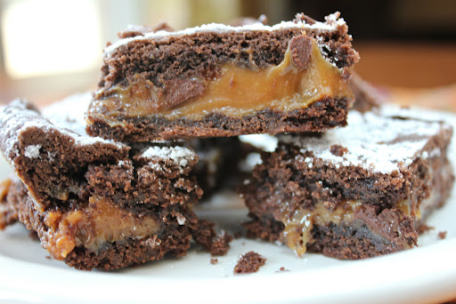 Here’s how it shakes out. Several weeks ago, I was gifted with a tin of brownies. To be specific: Killer Brownies from Dorothy Lane Market in Dayton, Ohio. There were four substantially-sized brownies in the tin, and each brownie was coated generously with a sifting of powdered sugar. But they weren’t just any brownies: they were multilayered, with a gorgeous caramel oozing out of the center layer. And the flavor. To die for. I ate them over the period of several days, more despondent with each bite that I was one step closer to being without them. And I didn’t ever want to be without them again.