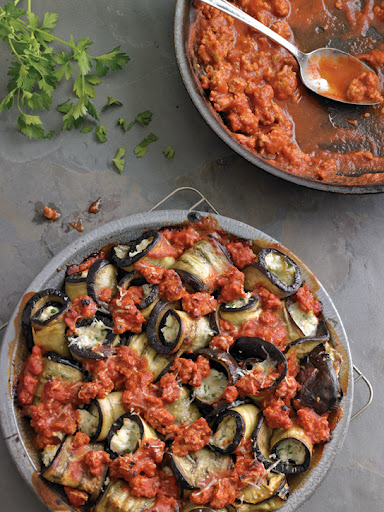 In a bowl, stir together the ricotta, mozzarella, 2 Tbs. of the Parmigiano-Reggiano and the parsley. Season with salt and pepper. Spread half of the sauce on the bottom of a 9-inch baking dish. Place a spoonful of the cheese mixture near the wide end of each eggplant slice, roll up, and place upright or upside down in the sauce. Spoon the remaining sauce between the rolls. Sprinkle with the remaining 2 Tbs. Parmigiano-Reggiano. Bake until the sauce is bubbling, about 20 minutes. Serve immediately. Serves 4.