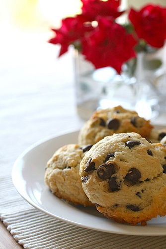 Preheat the oven to 375˚ F. Line a baking sheet with parchment paper or a silicone baking mat. Combine the flour, sugar, baking powder and salt in a medium bowl; stir to combine. Toss in the chocolate chips and stir to blend. Add the heavy cream to the flour mixture, stirring just until a dough forms and the dry ingredients are incorporated. Knead the dough very briefly with well floured hands to ensure even mixing.
