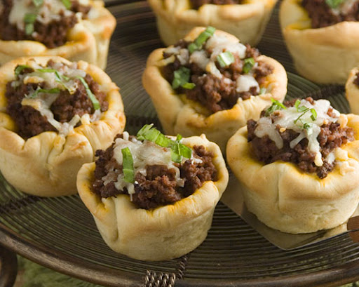 Spray counter lightly with non-stick cooking spray. Flatten each roll into a 5-inch circle. Cover with plastic wrap and let rest. Brown ground beef in a skillet. Stir in pizza sauce. Add Italian seasoning and salt & pepper to taste. Heat through. Remove wrap from dough circles. Evenly press a circle into each cup of a sprayed 12 cup muffin tin to cover bottom and sides. Divide 1/2 cup cheese evenly between the 12 muffin cups and sprinkle over dough in bottom of each cup. Divide beef mixture evenly and spoon over cheese. Bake at 350°F 20 minutes. Remove from oven and divide remaining cheese evenly between cups and sprinkle over top of meat. Bake an additional 5-10 minutes.