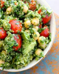 Make your quinoa first. Soak the quinoa in a pot in the veggie broth for about 15 minutes. After that, turn on the heat to medium high and let the quinoa come to a boil. Once it boils, reduce heat to medium/low and let quinoa simmer. Stir every so often, and cook quinoa for about 20-25 minutes just until the liquid absorbs. You don€™t want it completely dried out, so when there is just aTINYamount of liquid left in the pot, remove it from heat and put a lid on it. Set it aside, and make the rest of the salad by chopping up the rest of the veggies and combing dressing ingredients.