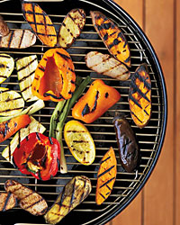 Light a charcoal grill. Grill the peppers over high heat, turning, until charred all over. Transfer to a large plate and let stand until cool enough to handle. Peel the peppers and discard the charred skins, seeds and stems. Quarter the peppers lengthwise and arrange them on a platter.