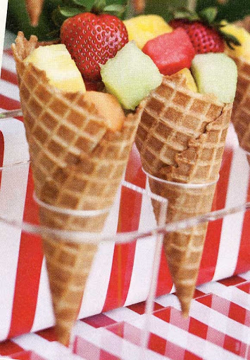 In a large bowl, combine cantaloupe, honeydew, watermelon, and pineapple. Spoon fruit into waffle cones. Top with strawberries.