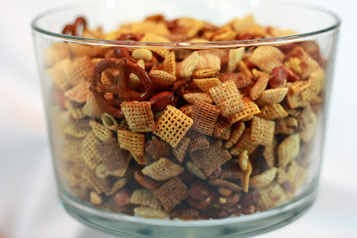 This was a very good snack mix. The seasoning is mild, but tasty. As other reviewers suggested I omitted the celery salt and used garlic powder rather than garlic salt. I baked mine in a Pyrex roasting pan and didn't have any issues with burning. My toasted oat cereal did shrivle up and look like something that had been stuck to my daughter's chair for a couple of days. Next time I will just replace them with something else. Because I have an 18 month old I replaced the nuts with Goldfish crackers.