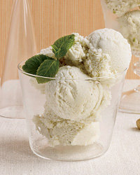 Strain the ice cream base into an ice cream maker, pressing the mint leaves with the back of a spoon to extract all of the flavor, and freeze according to the manufacturer's instructions. Pack the ice cream into a plastic container.