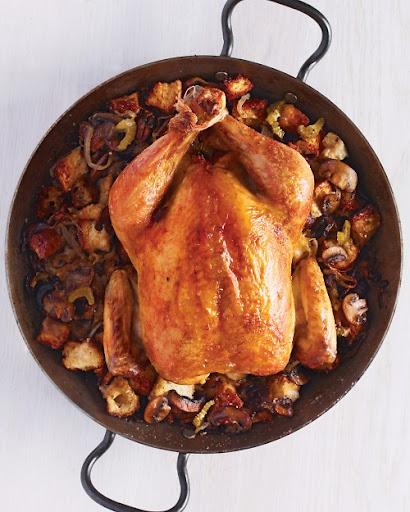Everyone loves stuffing, but baking it inside the bird means having to roast the chicken longer and risking dry meat, whereas baking it separately makes for a dull side dish. Here's how to get the best of both worlds: Rest your chicken atop this mushroom-and-sage dressing. The bread absorbs the juices while getting crisp and toasty on top. Best of all, the chicken cooks flawlessly on a fragrant bed.