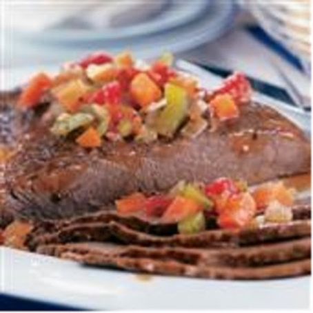 Bake for 3 to 3 1/2 hours or until meat is tender. Discard bay leaves. Transfer meat and vegetables to serving platter. Slice meat across the grain into 1/4-inch thick slices. Skim fat from pan juices. Serve with meat and vegetables.
