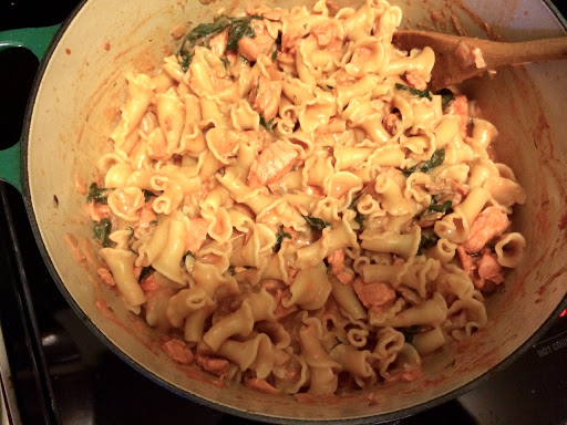 The original recipe calls for using penne pasta, but we substituted campanelle, as you can see in the photo. We also added raw spinach with the shallot. Artichoke hearts would be another good addition, and the salmon can be replaced by shrimp or sausage. The prep time mostly went into preparing the herbs; the rest of this dish is quick and easy.
