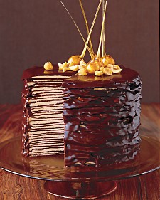 Place a crepe on a wire rack set over a rimmed baking sheet. Spread with about 3 tablespoons hazelnut filling. Top with another crepe. Continue layering with hazelnut filling and crepes, using about 32 crepes and ending with a crepe on top. Refrigerate until firm, about 15 minutes.