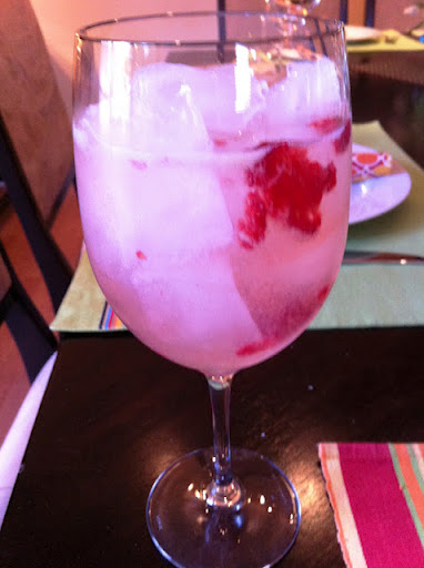 I emptied all of the liquid ingredients into a pitcher and stirred. Then I mashed about half the raspberries and put them in. Placed the rest of the raspberries in the glasses