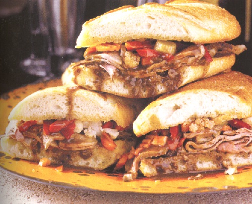 7. Place some meat on each roll, ladle some broth over the meat, and top with giardiniera vegetables and red peppers